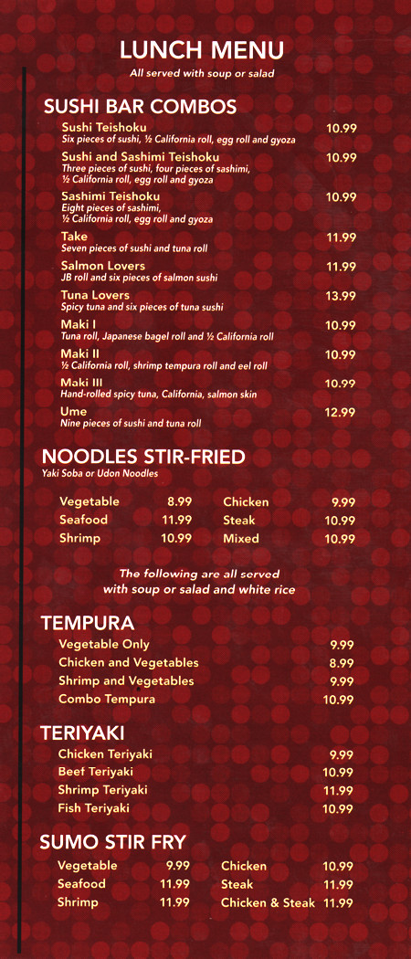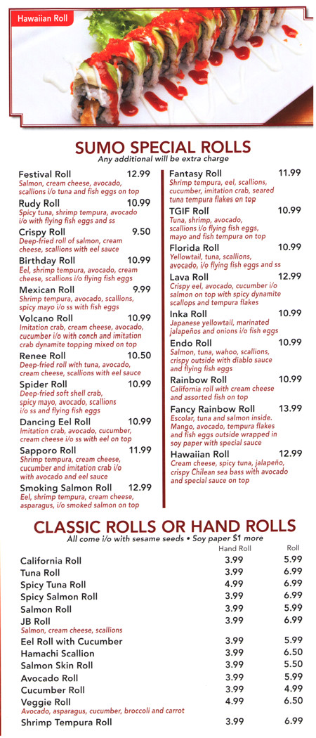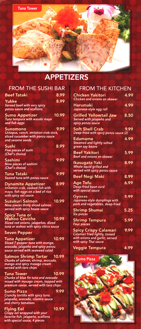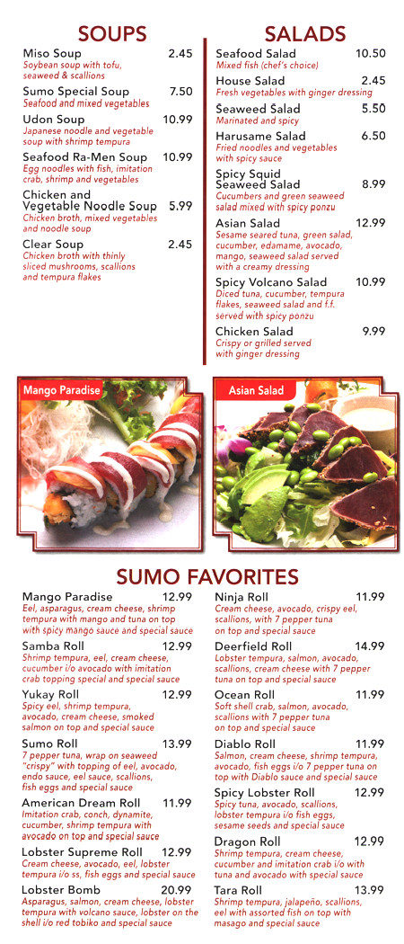 If you're in the mood for an authentic Japanese dining experience, the Sumo Japanese Restaurant Menu offers a delightful array of dishes that are sure to please any palate. Located at 3354 W Hillsboro Blvd, Deerfield Beach, FL, this cozy spot brings you everything from fresh sushi to sizzling hibachi platters. Whether you're craving something light like a delicate miso soup or a hearty bowl of ramen, there’s something here for everyone.